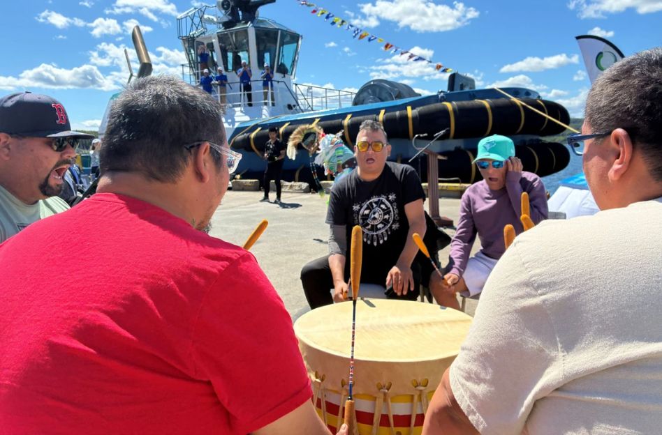 Hier treten Stoney-Bären-Sänger von Eskasoni bei einer Segnungszeremonie für drei neue Schlepper von EverWind an der Meerenge von Canso auf. Das Projekt wird auf deren Land gebaut und betrieben werden. Die grüne Wasserstoff-/Ammoniakanlage von EverWind sowie die damit verbundenen On-und Offshore-Windparks könnten weg von Südamerikas Kohle, weg von Öl aus dem Nahen Osten und weg von amerikanischem Fracking-Erdgas hin zu Export von grüner Energie führen. Europa ist bereit mehr Geld für die Abnahme von grüner Energie in die Hand zu nehmen.