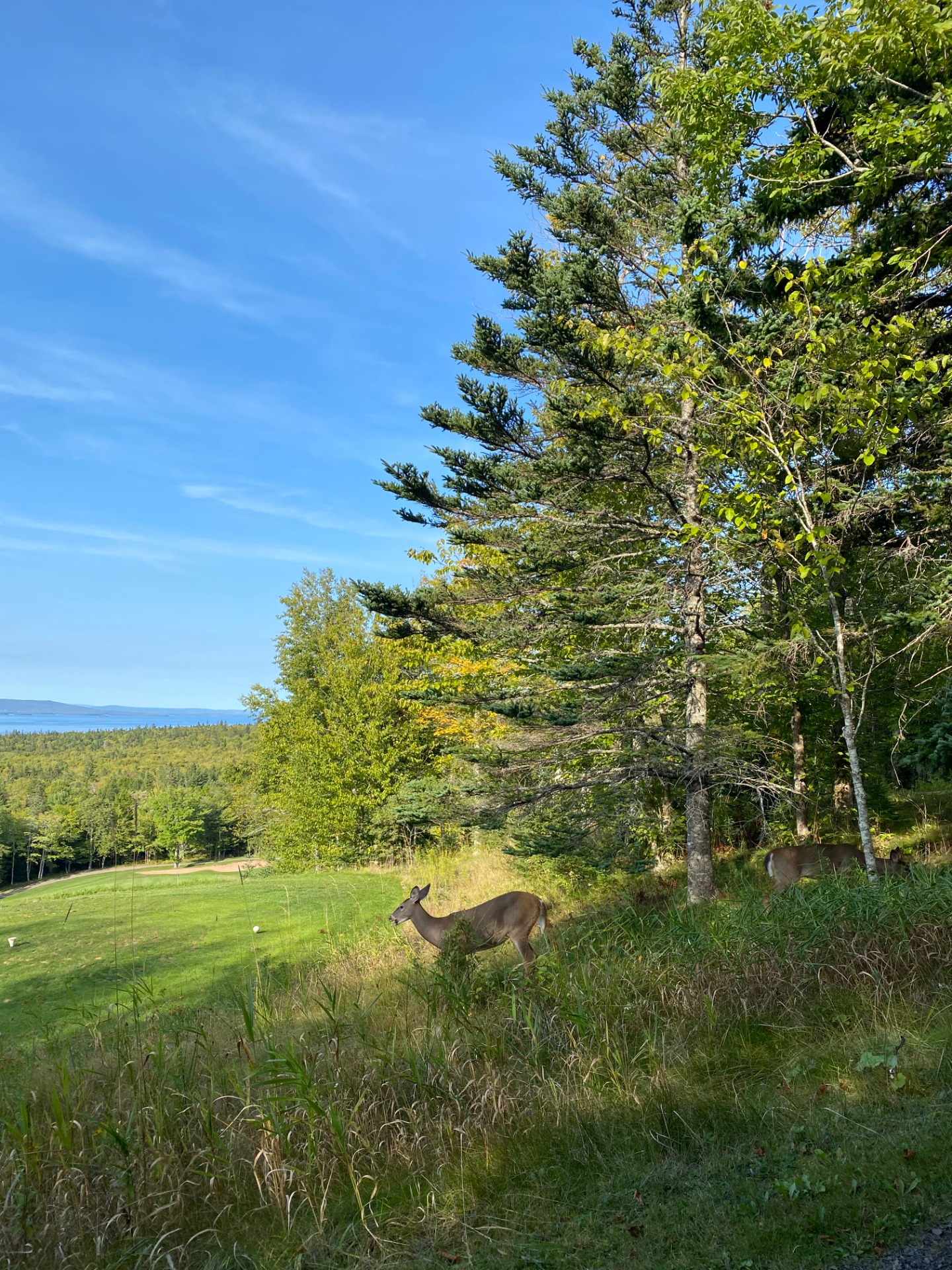 Golf gespielt. Nur mit dem 8er + Driver und Putter. War gut. Begegnungen mit einer Schar Kanadagänsen und mit drei Weißwedelhirschen. Bei traumhaftem Wetter haben wir den Platz fast für uns!
